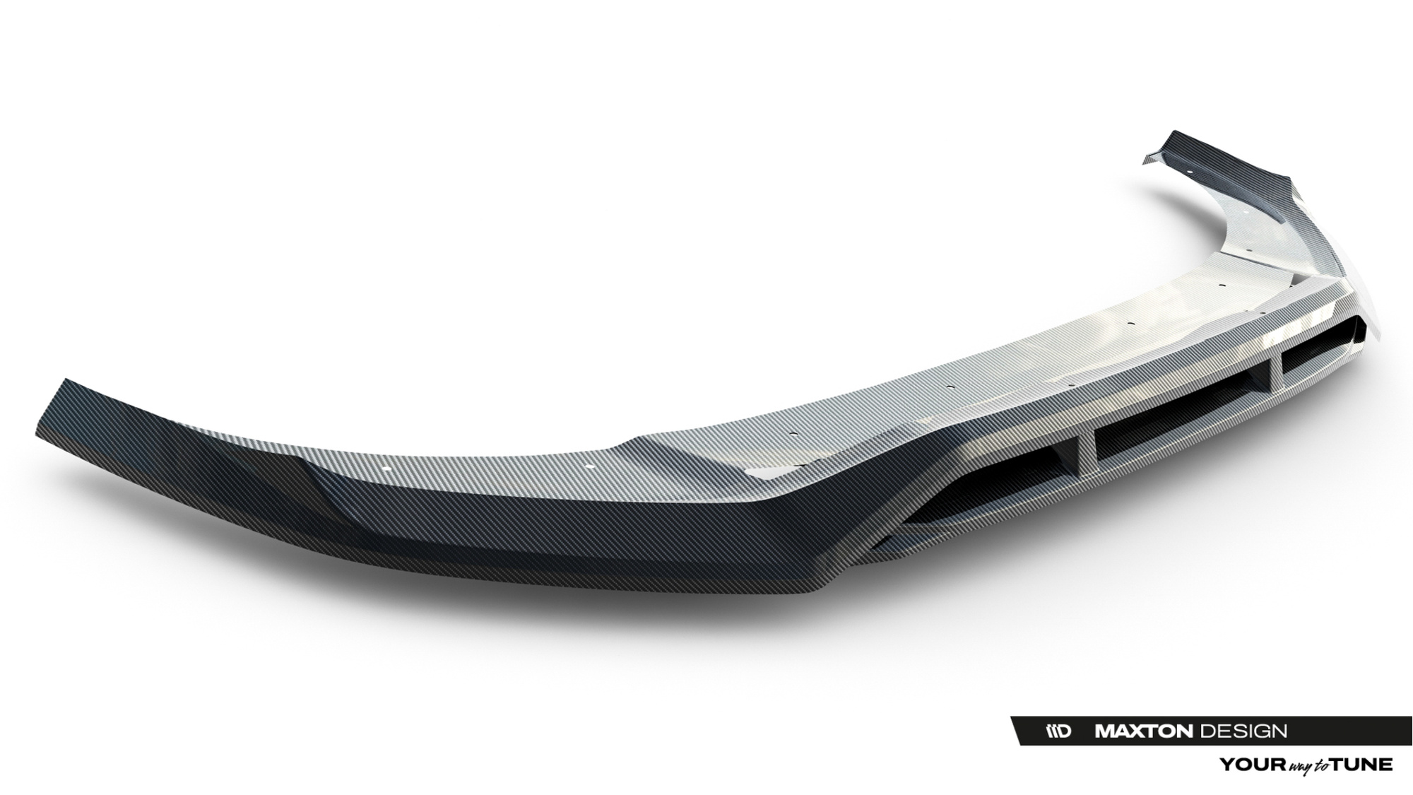 Przedni Splitter obniża nadwozie. Dzięki temu przestrzeń przepływu powietrza od przodu pod samochodem obniża się o 2 centymetry. Splitter wyposażony jest w otwory montażowe. Otwory te pozwalają uniknąć ingerencji w strukturę elementu, przez co nie obniżają jego wytrzymałości.